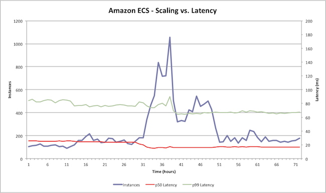 上圖顯示了一個負載測試的結果,在這次測試中,我們在Amazon ECS集群中添加和刪除實例,并測量72小時的周期內,調用‘Describe Task’API時,百分比排列位于第50位和第99位的延遲。你可以看到,盡管集群數量有較大的波動,但是延遲相對而言并沒有什么抖動。Amazon ECS可以如你所需地進行擴展,不管你的集群規模有多大,且根本無需操作或擴展集群管理器。