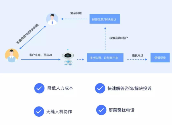 百應 AI 云座席具備強大的AI能力,客服接待場景下,支持將接入的電話實現分流,標準的和簡單的問題由智能接待機器人代為解答,在接待過程中,支持智能篩選錯誤來電、惡意來電,減少人工接待的數量,提升人工接待的質量,實現AI和客服同學的無縫配合。