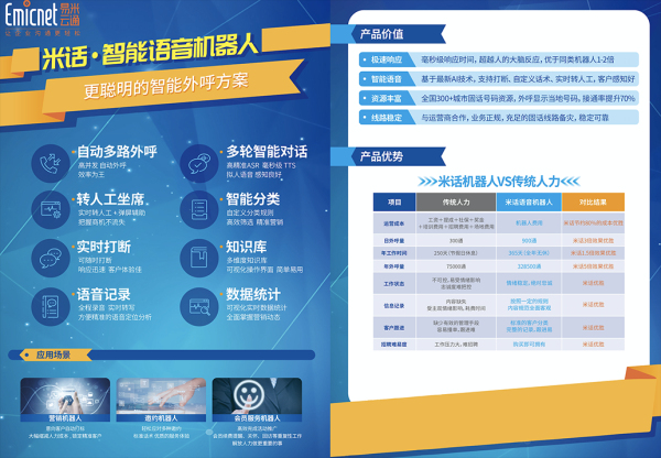 憑借對運營商行業的深刻理解,易米云通將自主研發的AI語音機器人融入深耕多年且已具備國內領先水平的智能語音通信領域,憑借強大的控制中臺進行合規外呼,并且通過與運營商系統的深度融合以及超卓的人機結合差異化服務功能,為運營商提供了從客戶通知到業務受理的通信行業應用場景全流程AI智能語音解決方案。