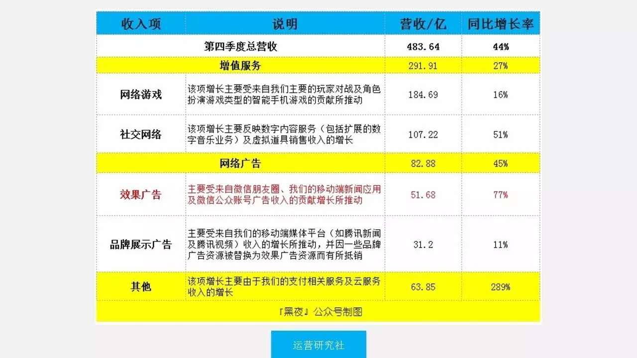 這是騰訊2016年第四季度的財報,其中以微信為主要載體的效果廣告營收51.68億,占騰訊整個廣告營收的62.3%,同比增長率達到驚人的77%。相比百度第四季度的網(wǎng)絡(luò)營銷營收161.66億。說明微信廣告開始爆發(fā)并有著巨大增長空間。
