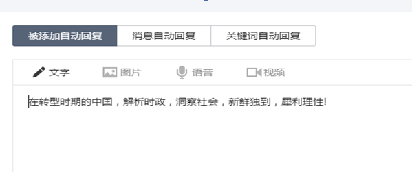 而自動(dòng)回復(fù)也是一個(gè)相當(dāng)重要的功能,被添加自動(dòng)回復(fù)就是粉絲關(guān)注你之后顯示的那條歡迎語(yǔ),消息自動(dòng)回復(fù)是粉絲在對(duì)話(huà)框里給公眾號(hào)發(fā)送消息,公眾號(hào)可以設(shè)置一些相關(guān)的回復(fù)內(nèi)容,而關(guān)鍵詞自動(dòng)回復(fù)是指粉絲通過(guò)在對(duì)話(huà)框中輸入關(guān)鍵詞,系統(tǒng)自動(dòng)回復(fù)想要的文字、資源、鏈接。靠這些功能可以完成和粉絲之間的一種被動(dòng)交流,是維系粉絲關(guān)系的好方法。