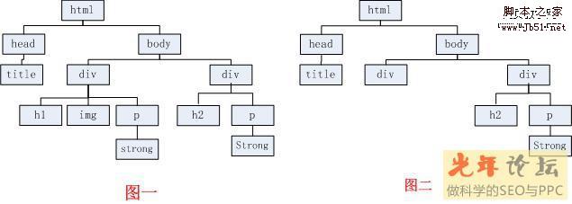 可以看到這是一段xhtml 1.0過渡標準下的html.卻有很多錯誤(錯誤包括:第一個div中h1>標簽沒有結(jié)束標簽.img沒有alt屬性。p>標簽也沒有結(jié)束標簽),但是如果把這段代碼放到瀏覽器中去執(zhí)行,卻可以看到正確的效果,h1>標簽起作用了。P標簽也起作用了,圖片也能顯示出來了,我們很奇怪為什么這段代碼連標簽都沒寫對為什么在瀏覽器中卻能正確解析,如果我們假設這段代碼是沒有錯的,它正確的dom結(jié)構(gòu)應該為下(圖一)所示