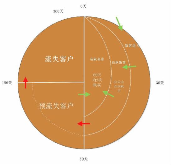 按之前我們所說的顧客生命周期,流失顧客可以放棄掉了,當然,如果錢多的話可以弄弄。我們主要是要喚醒近60天的顧客,對于預流失的顧客也可以進行營銷,但營銷的力度要大一些。