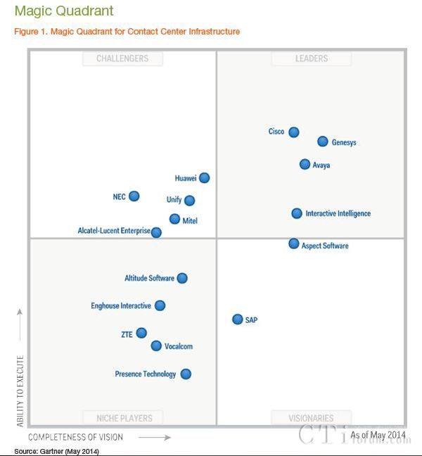 CTI論壇(ctiforum)7月8日消息(記者 孫磊):近日,全球最具權(quán)威的IT研究與顧問咨詢公司Gartner發(fā)布了聯(lián)絡(luò)中心魔力象限報告(Magic Quadrant for Contact Center Infrastructure),華為聯(lián)絡(luò)中心憑借功能全面、高可靠性、高集成度及良好市場表現(xiàn)的整體解決方案能力繼續(xù)位居Gartner 2014年全球聯(lián)絡(luò)中心魔力象限“挑戰(zhàn)者象限(Challengers)”第一名,市場份額位居全球第四。這是繼2012年來華為連續(xù)第三年穩(wěn)居該象限第一名。