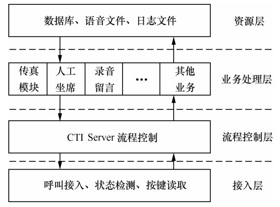 建立呼叫中心必須考慮系統的穩定性、引入新業務的靈活性以及系統功能的可擴展性。根據這些要求,采用分層設計的思想,可將呼叫中心系統的實現模型分為以下4層:接入層、流程控制層、業務處理層、資源層。如圖:
