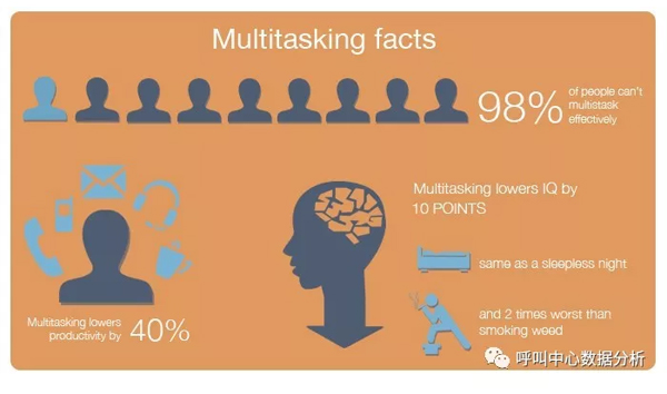 合理降低每個(gè)員工處理并發(fā)窗口的數(shù)量。相關(guān)研究表明,大多數(shù)人其實(shí)并不擅長(zhǎng)并行多任務(wù)處理。多任務(wù)并行,不但會(huì)降低響應(yīng)速度,而且會(huì)導(dǎo)致應(yīng)答質(zhì)量和差錯(cuò)率的上升。尤其是當(dāng)員工同時(shí)開(kāi)5~6個(gè)甚至7~8個(gè)窗口時(shí),很多人會(huì)顯得手忙腳亂,顧此失彼。而客戶卻傻傻地等在窗口前,半天得不到一句回應(yīng)。失望之下想關(guān)掉窗口,卻還要彈出一個(gè)滿意度調(diào)查,你說(shuō)是不是傻?并發(fā)窗口多少合適呢?根據(jù)國(guó)外的一項(xiàng)研究,這個(gè)數(shù)字大概是2.6左右,但還要取決于員工個(gè)人的技能熟練程度、所服務(wù)的業(yè)務(wù)內(nèi)容以及相關(guān)系統(tǒng)與知識(shí)庫(kù)的支撐能力,不能一概而論。