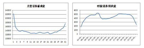 月度話務(wù)規(guī)律呈現(xiàn)U型,月初和月末話務(wù)需求偏高,月中話務(wù)需求偏低,主要受公司業(yè)務(wù)影響,月初為扣費(fèi)、出賬、開通集中日期,而月末則是扣費(fèi)、停機(jī)、咨詢以及取消集中日期。