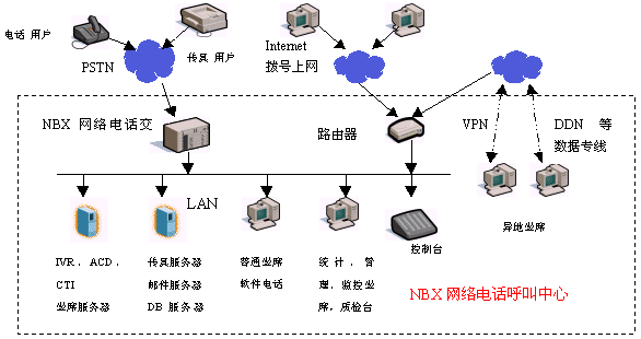 呼叫中心一般又稱為客戶服務中心,指企業或團體通過公開一個電話特服號碼(如:12315、95000等),提供對客戶的電話服務。NBX網絡電話呼叫中心是基于3Com 公司NBX網絡電話交換機平臺構筑的新一代語音、數據兩網合一的統一呼叫中心系統,支持統一消息服務,統一外部訪問路由,是各類傳統呼叫中心的升級換代產品。