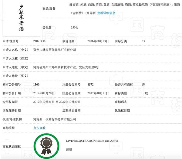 巨人網(wǎng)絡(luò)通訊聲明:本文標(biāo)題《少林寺多個(gè)涉酒類商標(biāo),成功注冊(cè)》,本文關(guān)鍵詞 少林寺,多個(gè),涉,酒類,商標(biāo),;如發(fā)現(xiàn)本文內(nèi)容存在版權(quán)問(wèn)題,煩請(qǐng)?zhí)峁┫嚓P(guān)信息告之我們,我們將及時(shí)溝通與處理。本站內(nèi)容系統(tǒng)采集于網(wǎng)絡(luò),涉及言論、版權(quán)與本站無(wú)關(guān)。