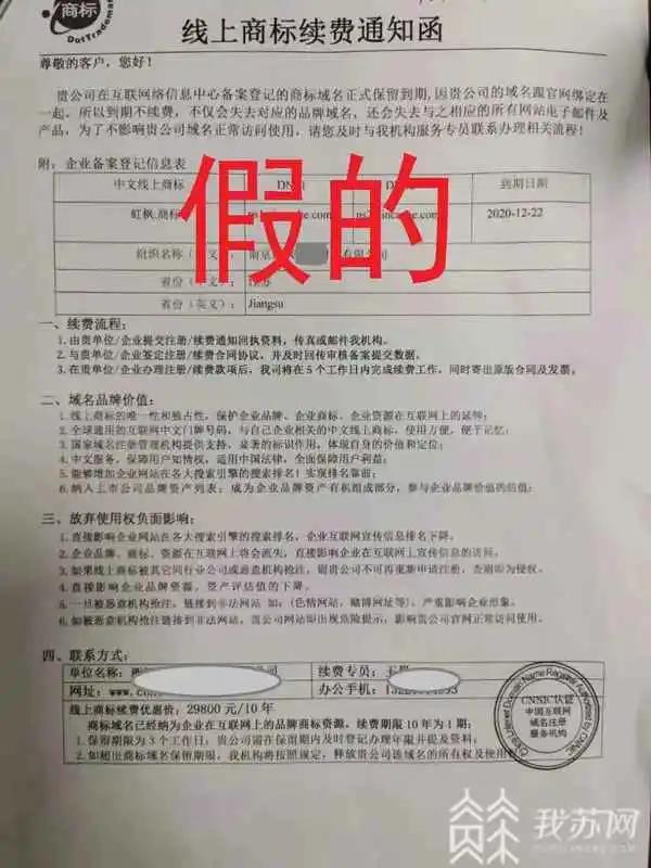 從南京市高淳區市場監管局獲悉,近日,高淳區市場監管局接到一商標申請人的咨詢,稱其收到一張“線上商標續費通知函”,上面寫有“貴公司在互聯網絡信息中心備案登記的商標域名正式保留到期,因貴公司的域名跟官網綁定在一起,所以到期不續費,不僅會失去對應的品牌域名,還會失去與之相應的所有網站電子郵件及產品,為了不影響貴公司域名正常訪問使用,請您及時與我機構服務專員聯系辦理相關流程!”字樣,并且還附有申請人商標的相關信息,及續費流程、域名品牌價值、放棄使用權負面影響和聯系方式等內容。