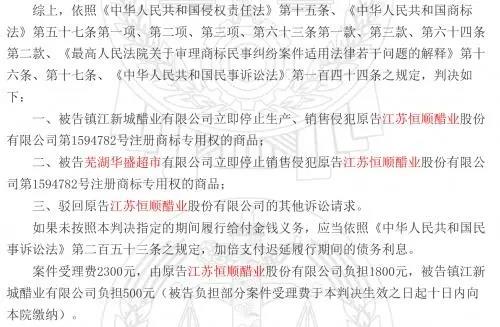 法院最終判決,被告鎮(zhèn)江新城醋業(yè)有限公司立即停止生產(chǎn)、銷售侵犯原告江蘇恒順醋業(yè)股份有限公司第1594782號注冊商標專用權的商品。