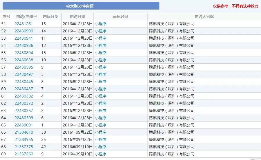 騰訊是第一個開始申請注冊“小程序”商標的,而且是45類全注冊,但是最終全部都沒有注冊成功。