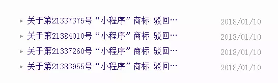 商評委經審理后,在今年1月份駁回了第21383955號、第21337260號、第21384010號、第21337375號“小程序”商標。
