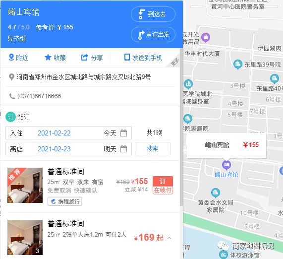 第二步,收藏。點擊上圖信息框右上側的“詳情”,會打開新的頁面,顯示該地點的名稱、附近的地標性地點,以及收藏、分享等選項。點擊收藏,該地點的標記就完成了,并同時被收藏到登錄用戶的收藏地點名單中。